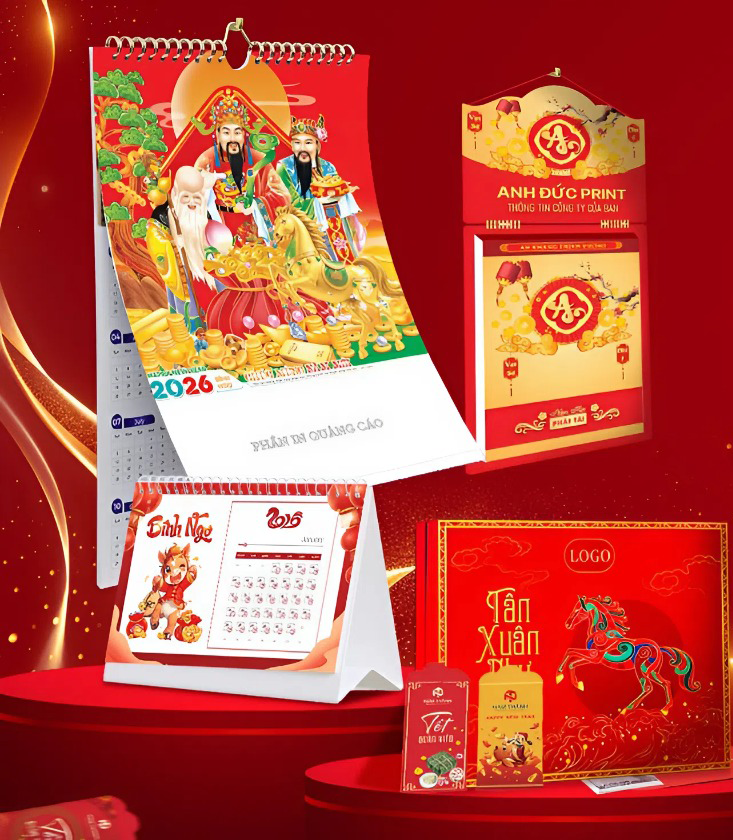 Sản xuất, in ấn trực tiếp lịch Tết độc quyền, thiết kế sáng tạo hiện đại tạo dấu ấn riêng cho từng thương hiệu, với đa dạng về sản phẩm lịch như Lịch Bloc độc quyền, lịch treo tường, lịch để bàn, lịch 52 tuần,…